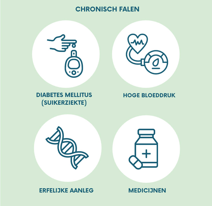 Nierschade ontstaat dus meestal niet plotseling, maar is het gevolg van andere aandoeningen die een langdurige belasting geven op de nieren.
