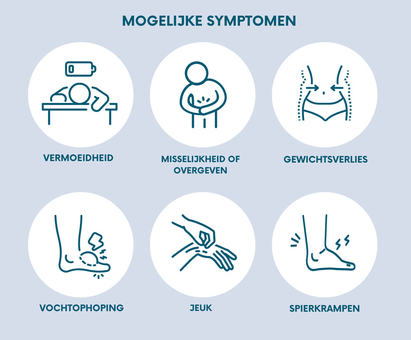 Veel mensen weten niet dat ze een probleem met hun nieren hebben. De nieren geven namelijk geen pijnsignalen als er iets mis is. Vaak ontstaan pas lichte klachten wanneer de nierfunctie is gedaald tot ongeveer 25–30% van de normale werking.De meeste mensen krijgen pas ernstige klachten op het moment dat de nieren bijna niet meer werken. In zo’n situatie is soms dialyse nodig om het bloed te zuiveren — een behandeling die veel invloed heeft op het dagelijks leven. Nierschade heeft niet alleen gevolgen voor de nieren zelf. Mensen met nierschade hebben ook een aanzienlijk hoger risico op hart- en vaatziekten, zoals een hartinfarct of beroerte. Daarnaast kunnen klachten ontstaan zoals vermoeidheid, een verminderde eetlust, vochtophoping of een verhoogde bloeddruk.